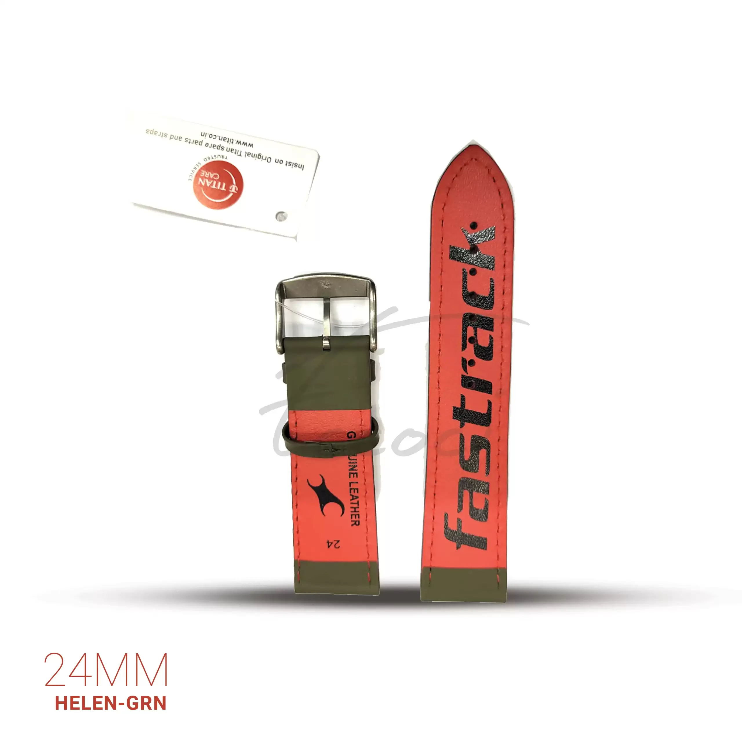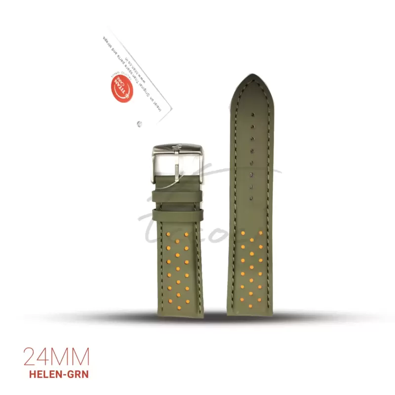 Concoct a style insurgence with this HELEN-H-Green watch strap from Titan. Designed with care using high-quality genuine leather, it will be very comfortable on the wrist. It has a buckle closure and multiple holes to ensure a secure fit. This strap will be set in any case that accommodates a 24 mm band.
