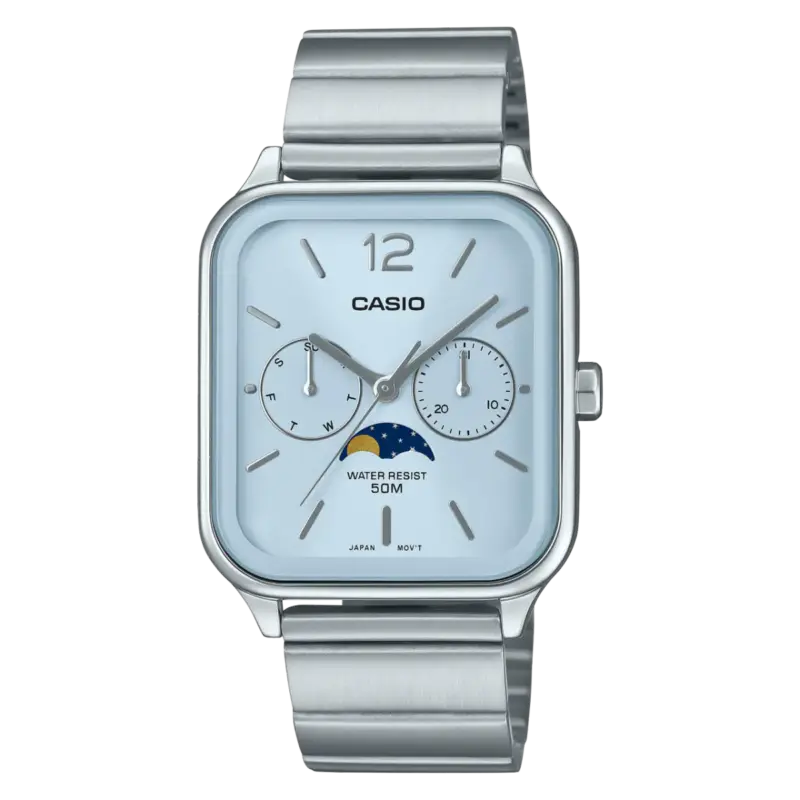 Discover the Casio MTP-M305D-2AV — a stylish stainless-steel men’s watch featuring moon-phase, day/date sub-dials, 50 m water-resistance, and dependable Japanese quartz movement. Perfect for everyday wear or special occasions