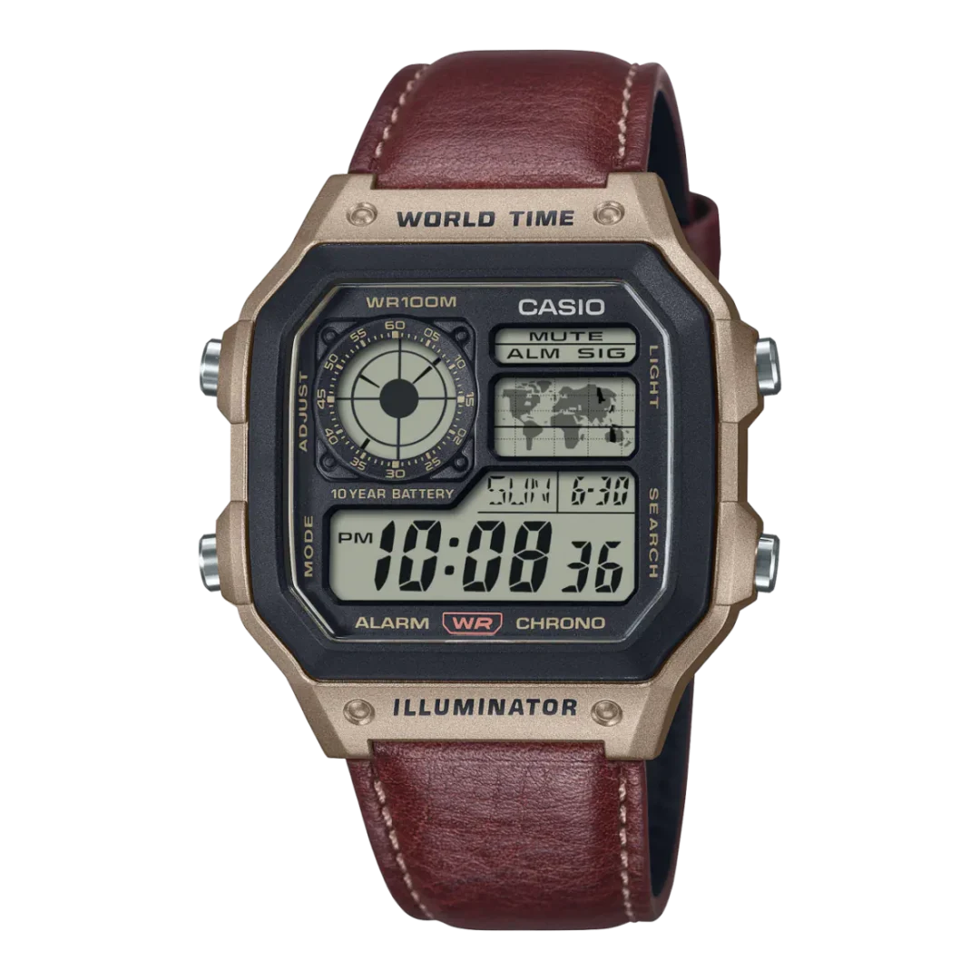 Get the original Casio AE-1200WHL-5AV (Casio Royale) digital watch in Bangladesh at the best price. Retro design, world time, LED light, 10-year battery – perfect for daily use!”Buy Casio AE-1200WHL-5AV online in Bangladesh. Stylish leather strap, world time, stopwatch & more. 100% genuine product with fast delivery & warranty.”