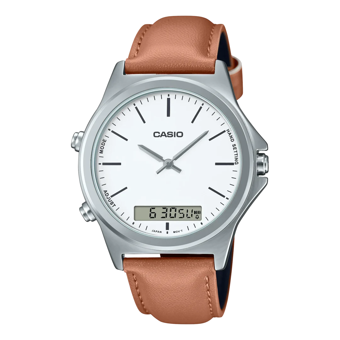 The classic timepiece MTP-VC01L-7EUDF sophisticated streamlining with a simple, clean watch face for a super-easy read. No need to sacrifice function for fashion. The minimalist design features a handy digital display for stopwatch, auto calendar, and World Time to keep you on time wherever you go. Choose tradition with a stainless steel link band or keep it a bit more casual with a leather band. Either way, your fashion statement is always spot-on.