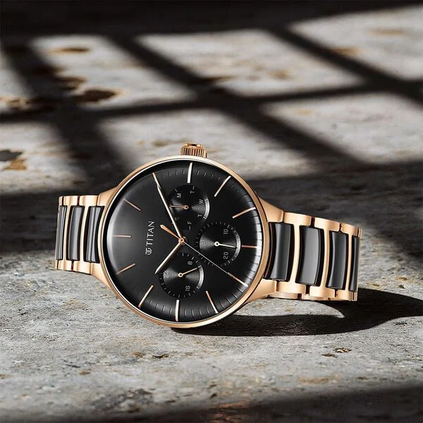 The Titan Ceramic Fusion 90148KD03 is where modern design meets timeless elegance. Featuring a bold black multifunction dial and a rose-gold dual-toned stainless steel bracelet, this watch is crafted for men who value sophistication and precision.