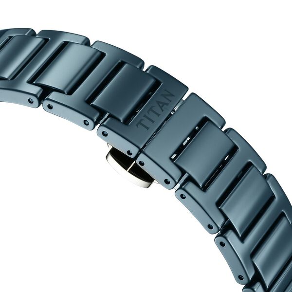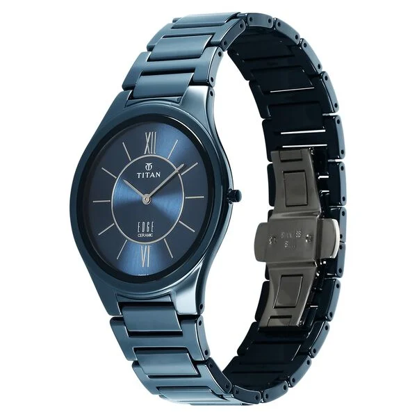 Feature Details Model 1696QC03 (Titan Edge Ceramic) Dial Color Glossy Electric Blue Strap & Case Material High-grade Ceramic, blue tone Glass / Crystal Sapphire crystal — scratch resistant Movement Quartz for accurate timekeeping Case Dimensions Width ~40.50 mm, Thickness ~4.20–4.40 mm — very slim design Clasp / Lock Butterfly clasp — secure and stylish fit Water Resistance Everyday splash protection; possibly ~30 meters (check retailer info) Warranty & Authenticity Buy from autho